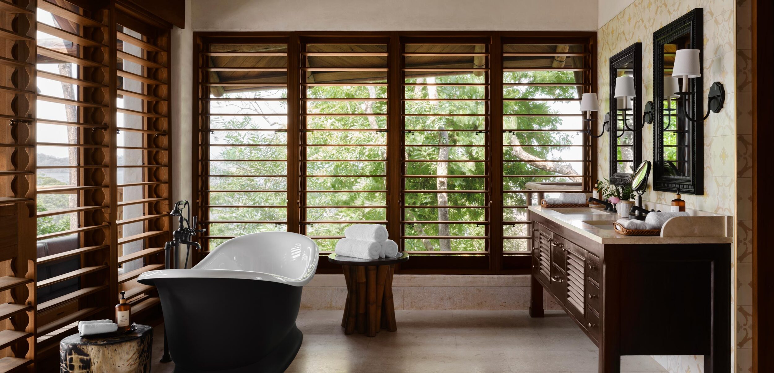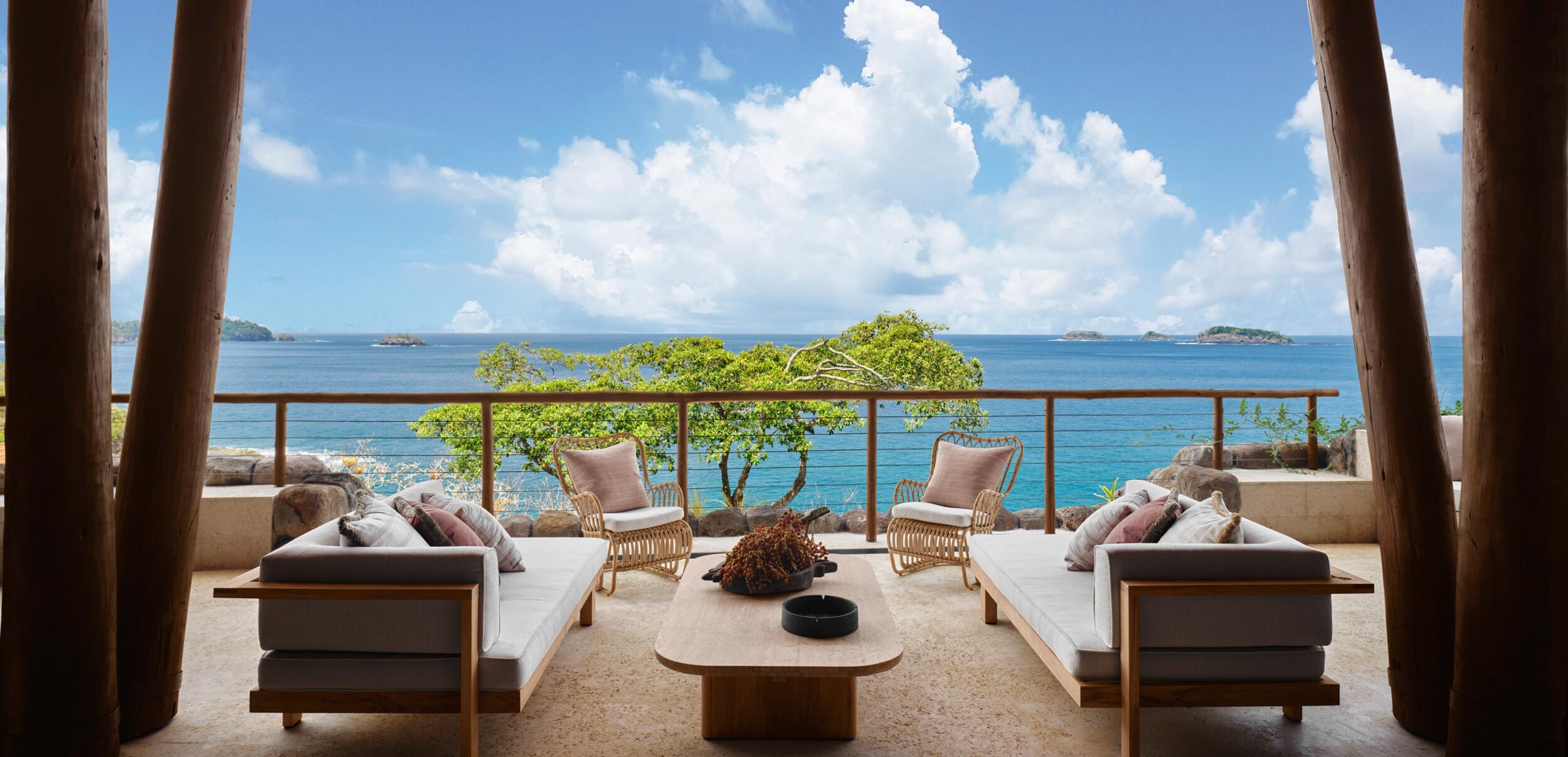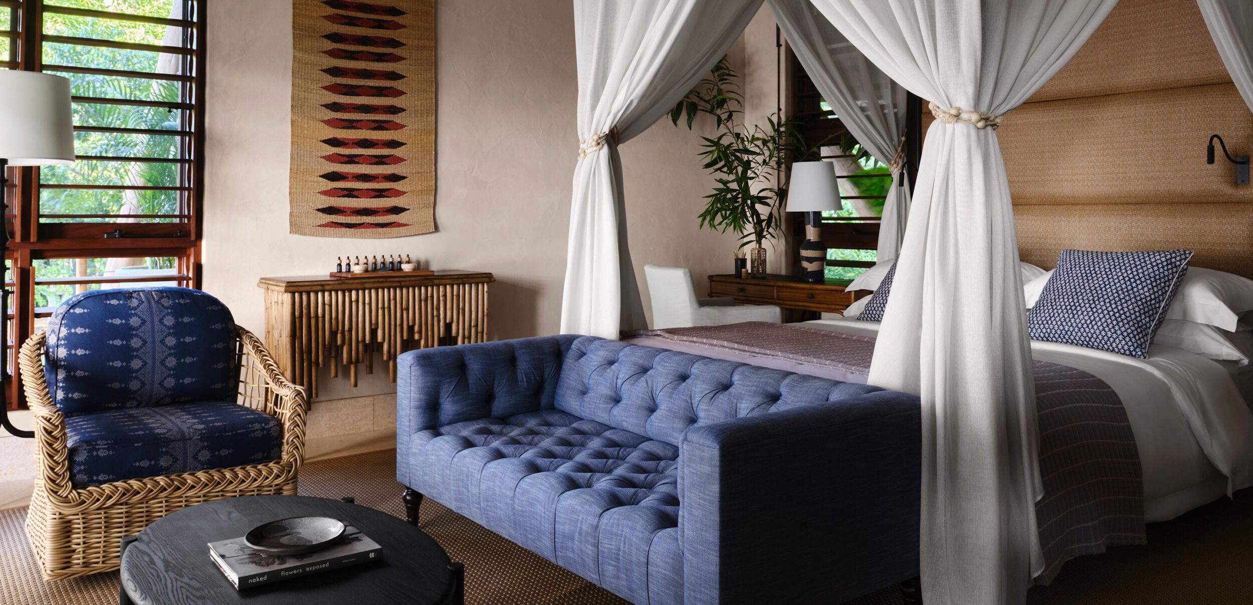 El ambiente de la residencia de lujo de Islas Secas es táctil y orgánico, donde la teca recuperada y los tejidos reciclados se mezclan con sofás forrados de lino, cerámica con influencias marinas, sillas de ratán de estilo colonial y tejidos locales con motivos tribales. Los árboles que han caído en el archipiélago se han reutilizado en hermosos muebles, mientras que las obras de arte tradicionales comisionadas y hechas a mano en Panamá por la tribu indígena Guna adornan las paredes junto a pinturas de artistas locales emergentes. Las habitaciones cuentan con camas con dosel y amplios baños privados con azulejos geométricos hechos a medida, todos ellos con ventanales y enormes balcones. Las asombrosas vistas al océano son estándar.