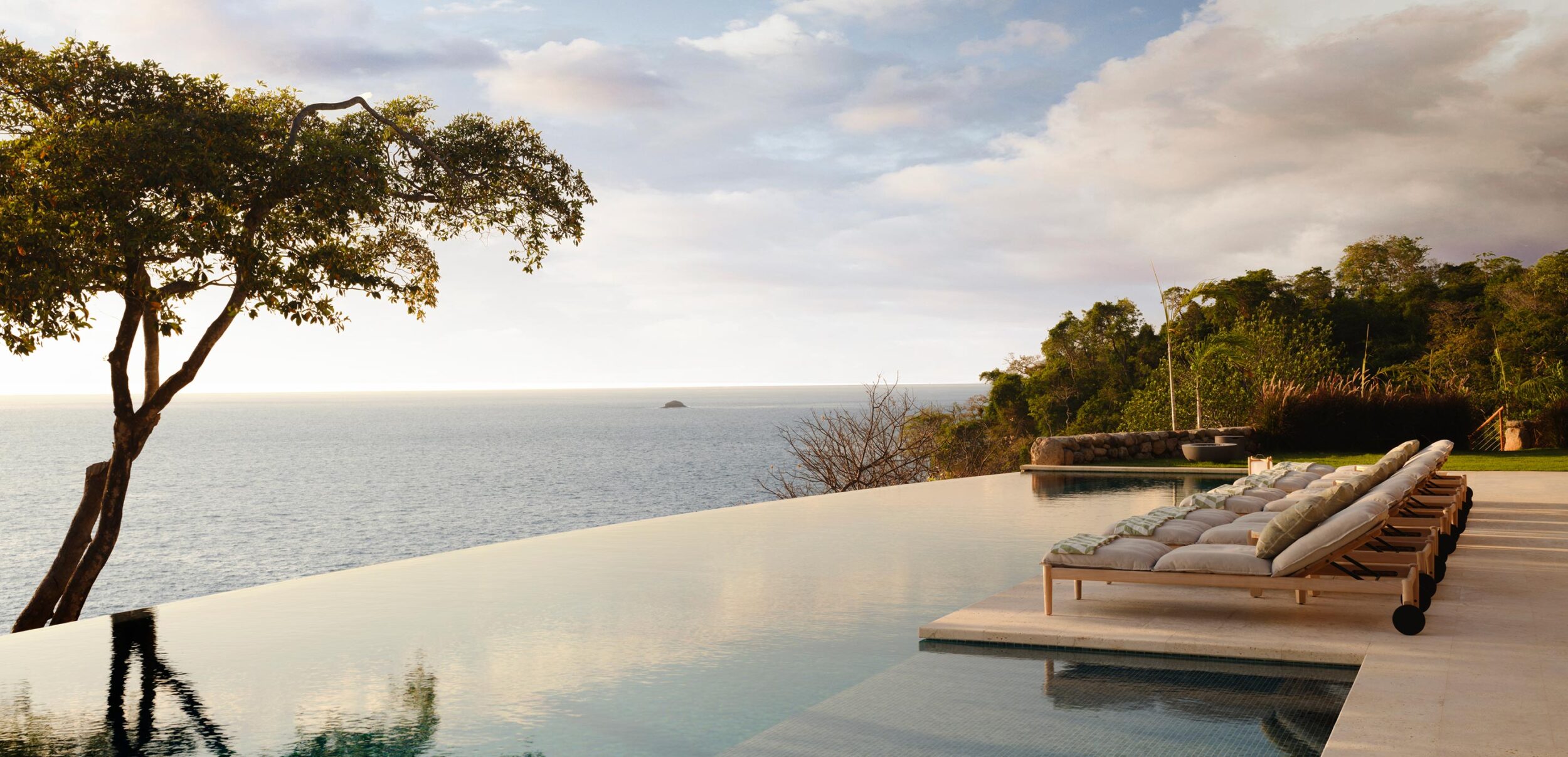 Enormes troncos de eucalipto, recolectados de forma sostenible, emergen del suelo de piedra de coral y se elevan para sostener un extraordinario tejado ondulado, diseñado en honor a la forma de una raya o de las alas de una fragata. Con techos de triple altura que enmarcan perfectamente las vistas al océano y capturan la brisa marina, cada ángulo ofrece un puesto en primera fila para contemplar el esplendor del Pacífico. Siguiendo el flujo del edificio, se llega a una piscina semiolímpica infinita, rodeada de tumbonas y un hermoso salón al aire libre bajo frescos de piedra. Una terraza comedor se extiende sobre el borde de la piscina. Esta es la casa de vacaciones de lujo que siempre ha deseado.